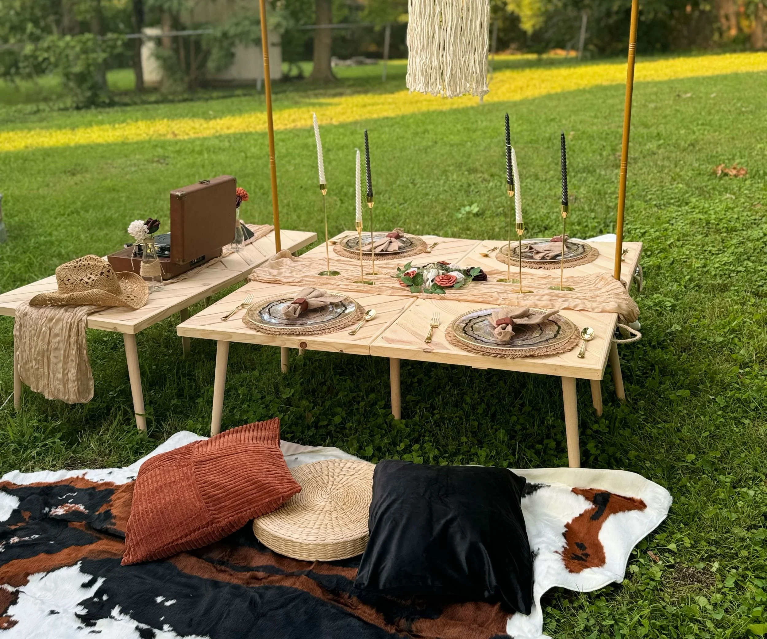 This theme blends country charm with upscale picnic elegance. Expect cozy seating, vintage western décor, and an optional spread of Southern-style bites, all set against the backdrop of Nashville’s natural beauty.