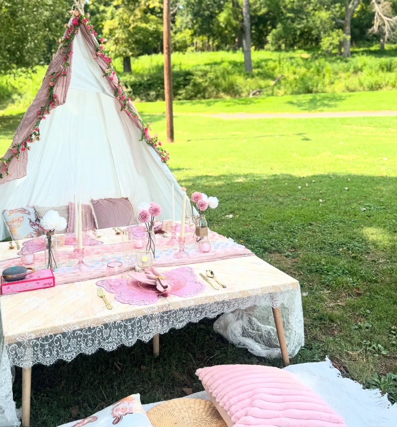 The Rustic Rodeo Luxury Picnic features soft cowhide rugs and a striking bull centerpiece for a cozy yet bold touch. Decorated in neutral tones with plush blankets and cushions, it’s a fan favorite!