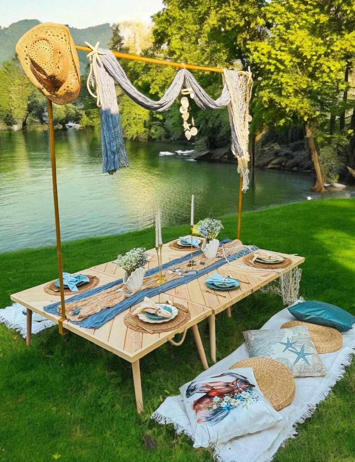 Experience the perfect blend of coastal charm and rustic elegance with our Coastal Cowgirl themed luxury picnic, bringing a touch of the coast to Nashville. Enjoy blankets, cushions, and a beautifully styled coastal tablescape, perfect for creating unforgettable memories.