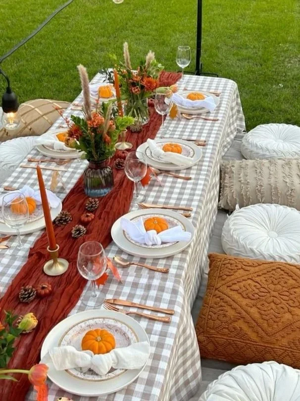 Our Pumpkins & Prosecco Luxury Picnic is the ultimate fall experience. Styled with a warm autumn palette, cozy blankets, glowing candles, and festive pumpkin décor, it includes a chilled bottle of prosecco to toast the season. Guests can also add a seasonal charcuterie board or fall-inspired bites for an elevated touch. Perfect for date nights, girls’ days, or celebrating pumpkin season in style.